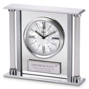 The Bulova Pearlized Column Clock's classical architectural style blends with strong metal and delicate faux mother of pearl materials to showcase an elegant timepiece that fits easily into any décor style. Bulova's high attention to quality and detail comes to life in this clock with slim roman numeral display and quartz movement. To make your gift even more personal, custom engrave this plaque below the clock face with any name, logo, and/or text.