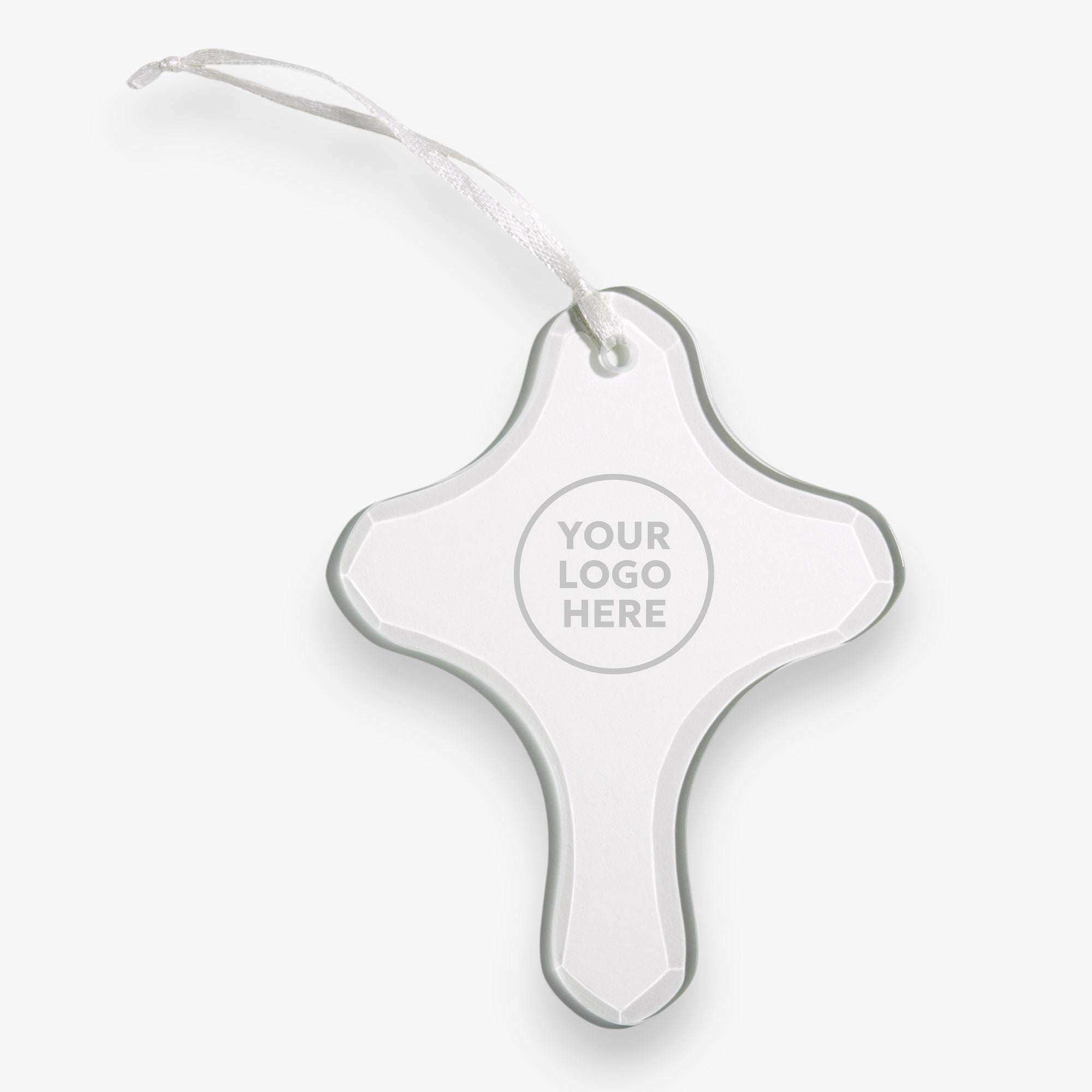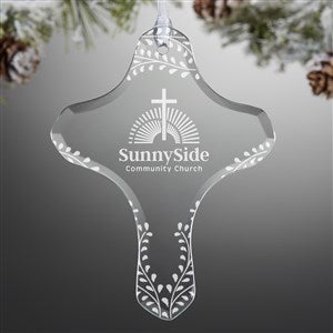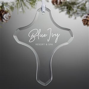 Celebrate the holidays with the Personalized Logo Cross Ornament. This glass ornament is carefully engraved with any name, logo, and/or text. With a classic cross shape, this ornament makes for the perfect gift from any charity or religious organization.